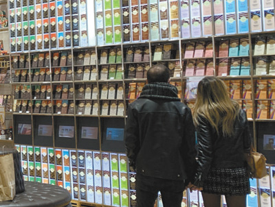 在意大利罗马的一家闻绮店内,顾客驻足欣赏巧克力墙。