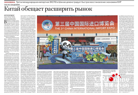 《俄罗斯报》在《中俄锐评》专栏刊发题为《进博会彰显中国对外开放市场的坚定承诺》的评论文章。文章指出,第三届中国国际进口博览会是新冠疫情暴发后首个如期举行的全球经济盛会。