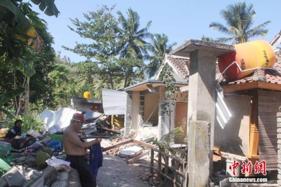 图为8月7日,位于该岛Senggigi 海滩附近Senggigi村的损毁房屋。该村数百座房屋损毁,全村断水断电,村民在村子空地上分散安置。中新社记者 林永传 摄