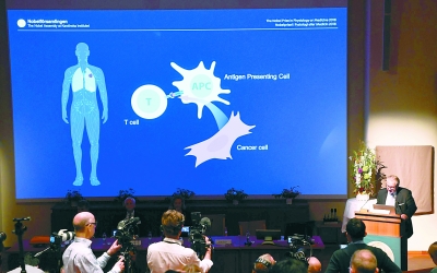 当地时间2018年10月1日,瑞典斯德哥尔摩,2018年诺贝尔生理学或医学奖授予美国科学家詹姆斯·艾利森和日本科学家本庶佑。