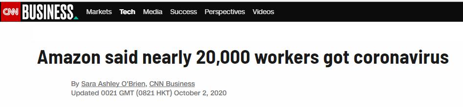 在1日的一则博客中,亚马逊表示已完成“亚马逊和Whole Foods(亚马逊旗下连锁超市)全部137.2万在美国的一线员工从今年3月1日至9月19日的数据分析”,与约翰·霍普金斯大学的疫情数据对比之后,阳性数据要比预期低42%。亚马逊表示,公司已采取若干措施防止病毒传播,包括150种“工作程序变化”。