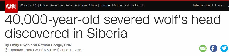 【环球网报道 记者 李东尧】据美国有线电视新闻网(CNN)11日消息,西伯利亚东部近日发现一颗4万年前的“野狼断头”,在永久冻土的环境下,狼头的牙齿与皮毛保存完好。