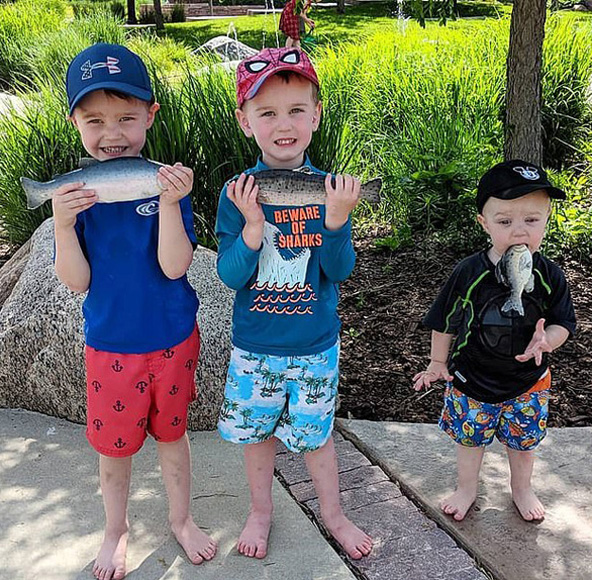 照片中,三个男孩站在南达科他州布鲁金斯儿童博物馆外,老大老二手中各拿一条鱼笔直地站着,最小的男孩则把鱼咬在嘴巴里,两只手笨拙地放在身前,满脸困惑。