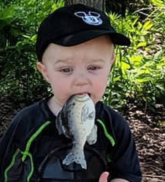 小儿子把鱼咬到嘴巴里满脸疑惑