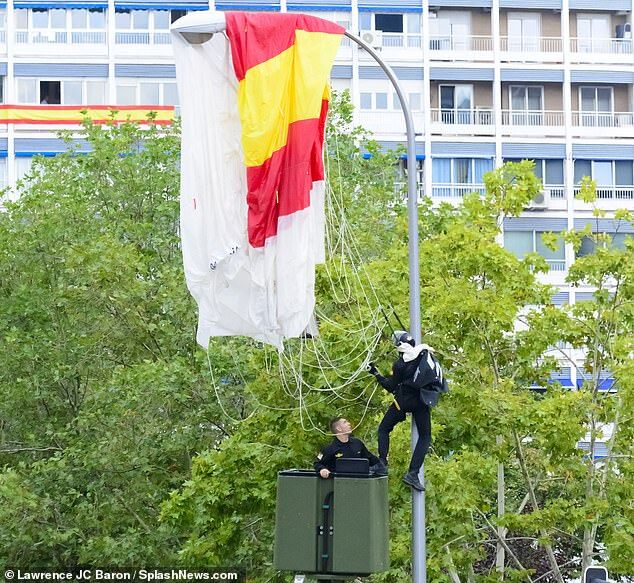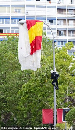 【环球网报道 记者 侯佳欣】10月12日是西班牙国庆日,盛大的阅兵仪式也在首都马德里如期举行。然而,现场出现了尴尬一幕:携带西班牙国旗的伞兵正在上演“从天而降”时,不料却因操作失误挂在了路灯灯柱上。众人惊呼之余,纷纷鼓掌以化解尴尬,连国王费利佩六世也跟着鼓起了掌。(伞兵被挂在灯柱上。