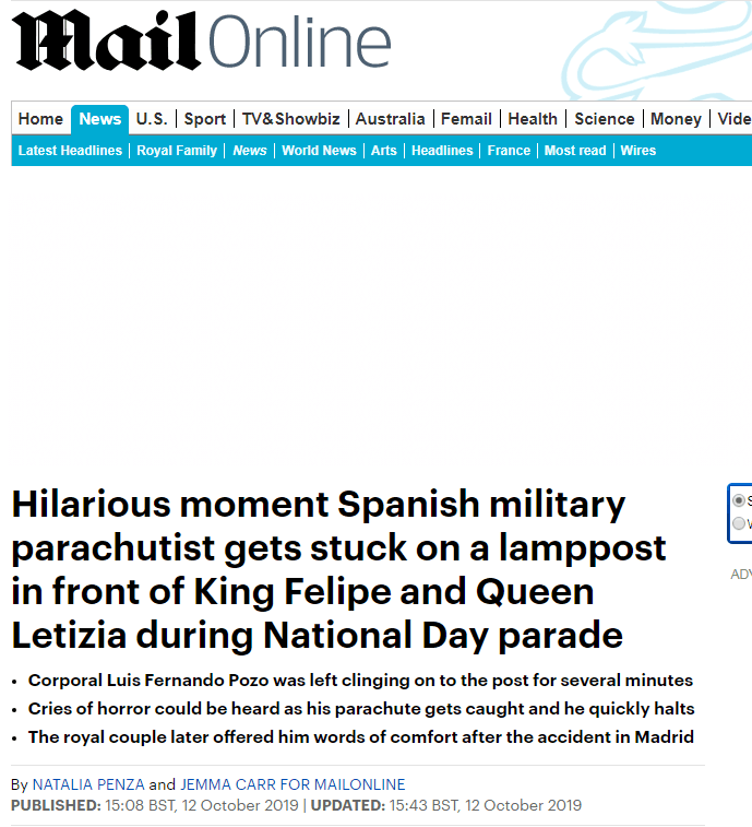 据英国《每日邮报》报道,这名伞兵名叫路易斯·费尔南多·波索,是一名下士。根据西班牙国防部官员的说法,这名伞兵是一名拥有600多次跳伞经验的老兵。这次意外让波索遭受了一些“痛苦”,但幸运的是,他并没有受伤。
