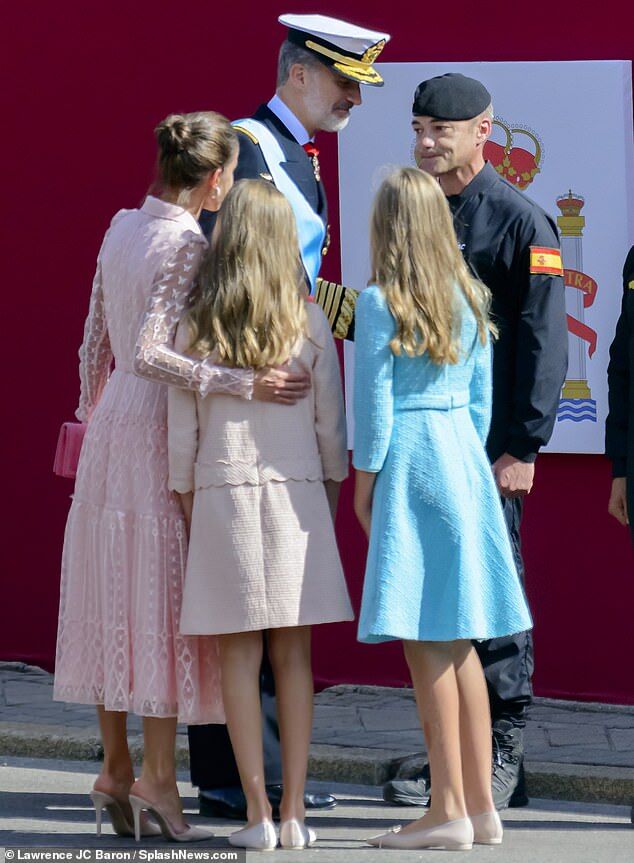 当天,西班牙国王费利佩六世携妻女一起出席当天的国庆日活动。根据视频显示,国王身着军装,站在人群中央。