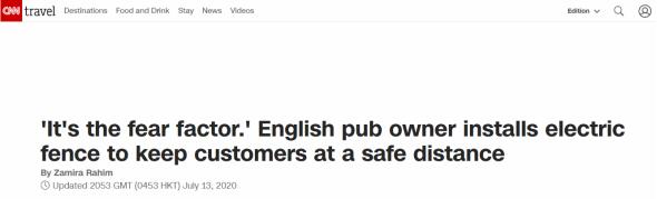 当地时间7月4日,英格兰地区的酒吧获准重新开门营业。据美国有线电视新闻网(CNN)7月13日报道,尽管疫情有所好转,但是这家酒吧老板仍然担心员工或者顾客因未保持社交距离而感染新冠。于是他想出了这样一个办法:在吧台前装设电围栏,不准顾客越雷池一步。