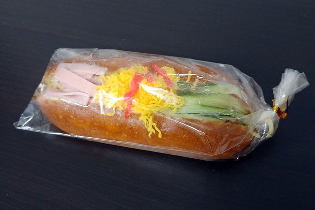 “凉面面包”里面夹着火腿、黄瓜、鸡蛋丝、红姜、面条共五种材料,还带有粘稠的酱汁。