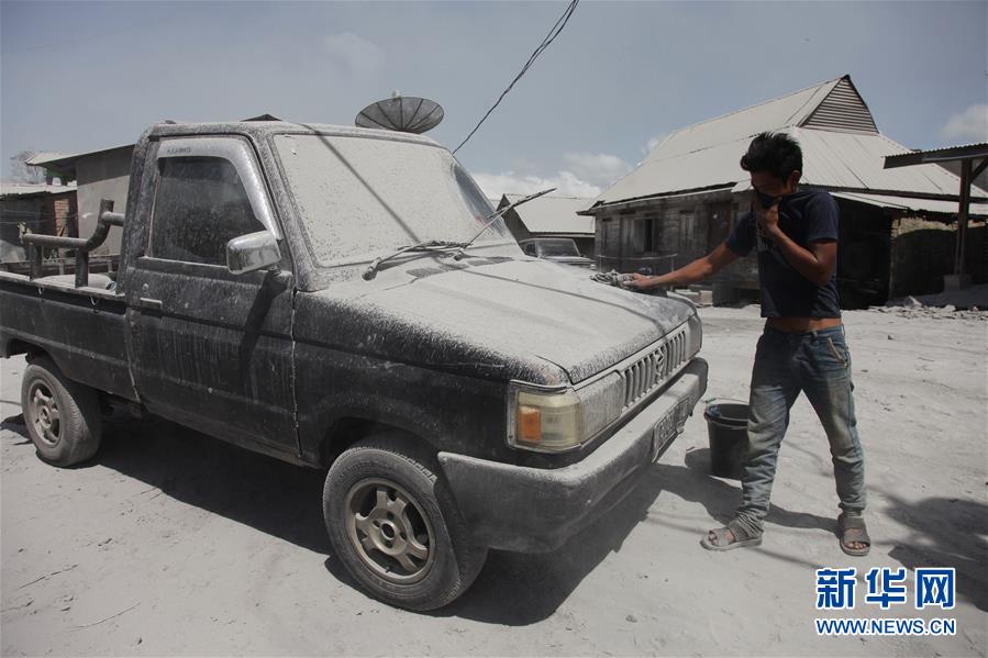 8月10日,在印度尼西亚北苏门答腊省卡罗县,当地居民清理汽车上覆盖的火山灰。 印度尼西亚国家抗灾署10日说,印尼北苏门答腊省锡纳朋火山当天剧烈喷发,喷出的火山灰高达5000米,目前尚无人员伤亡和财产损失报告。 新华社发(达马尼克摄)