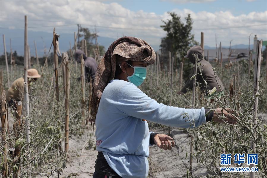 8月10日,在印度尼西亚北苏门答腊省卡罗县,当地居民在覆盖着火山灰的田地里劳作。 新华社发(达马尼克摄)
