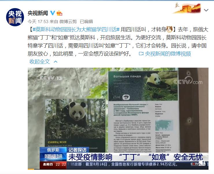去年,旅俄大熊猫“丁丁”和“如意”抵达莫斯科,开启旅居生活。为更好交流,莫斯科动物园园长特意学了四川话,需要用四川话叫“如意”“丁丁”,它们才会转身。园长说,请中国朋友放心,如此明星,一定会想方设法保护好。