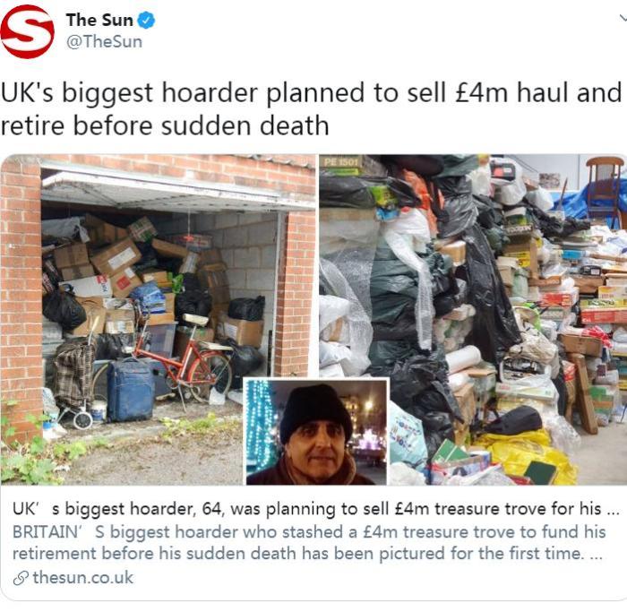 中新网10月11日电 据台湾联合新闻网报道,英国一位老人有囤积物品的习惯,在约20年间搜集了近6万件物品,只为在自己年老时能卖掉养老。但没想到的是,他在64岁时不幸因心脏病猝死。家人在整理其遗物并准备拍卖时才知晓,预计这些物品总价值最高达400万英镑。