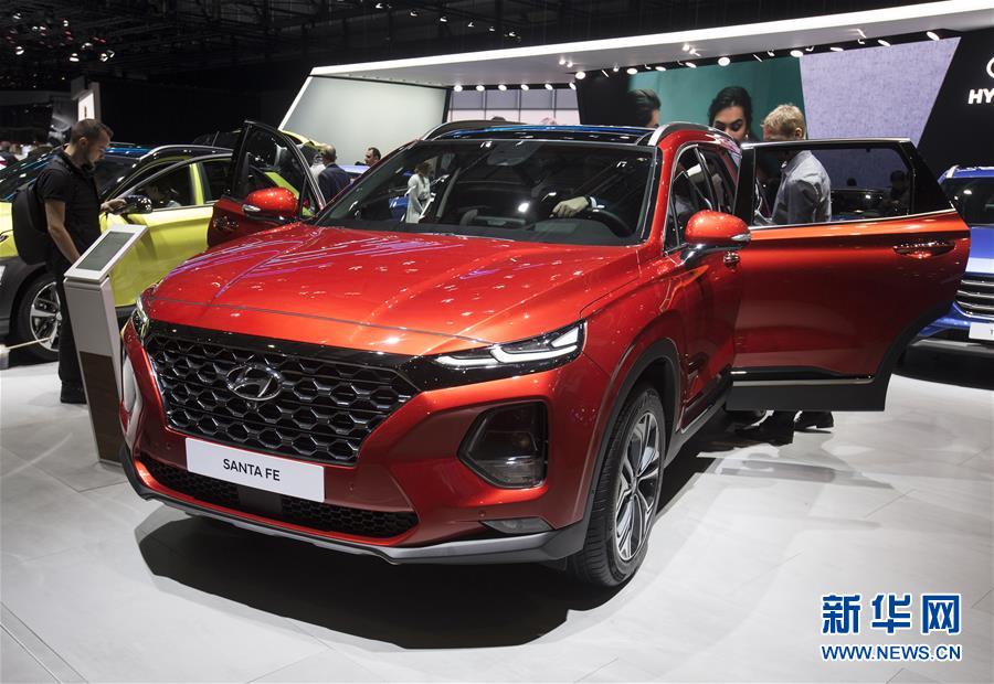 这是3月7日在瑞士日内瓦国际车展上拍摄的现代新款Santa Fe汽车。第88届日内瓦国际车展7日继续向媒体开放。车展将于3月8日正式拉开帷幕,全球约180家汽车及零配件厂商参展。 新华社记者 徐金泉 摄