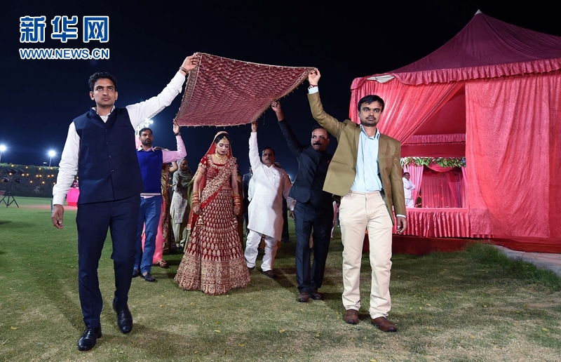 3月6日,在印度首都新德里,结婚现场,新娘在家人陪伴下走进婚礼现场。新华网记者张迺杰摄