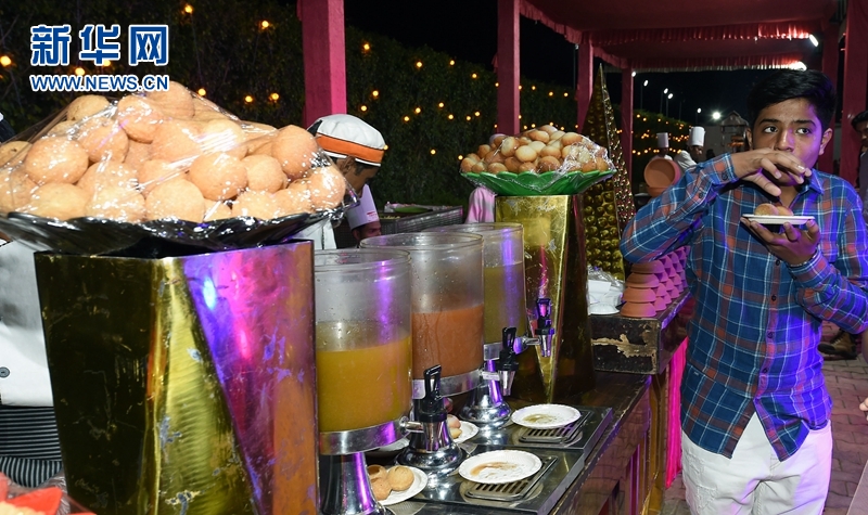 3月6日,在印度首都新德里,结婚现场,一名男孩在品尝印度美食。新华网记者张迺杰摄