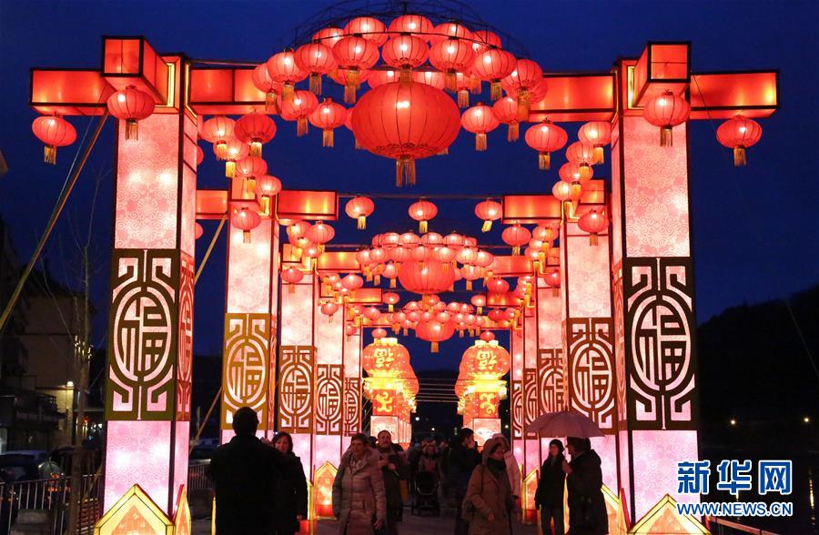 3月9日,在比利时迪南,游客们欣赏来自中国的彩灯。作为中欧“光之桥”活动的一部分,大型自贡彩灯展9日晚在比利时瓦隆大区旅游名城迪南拉开帷幕。新华社记者王晓郡摄