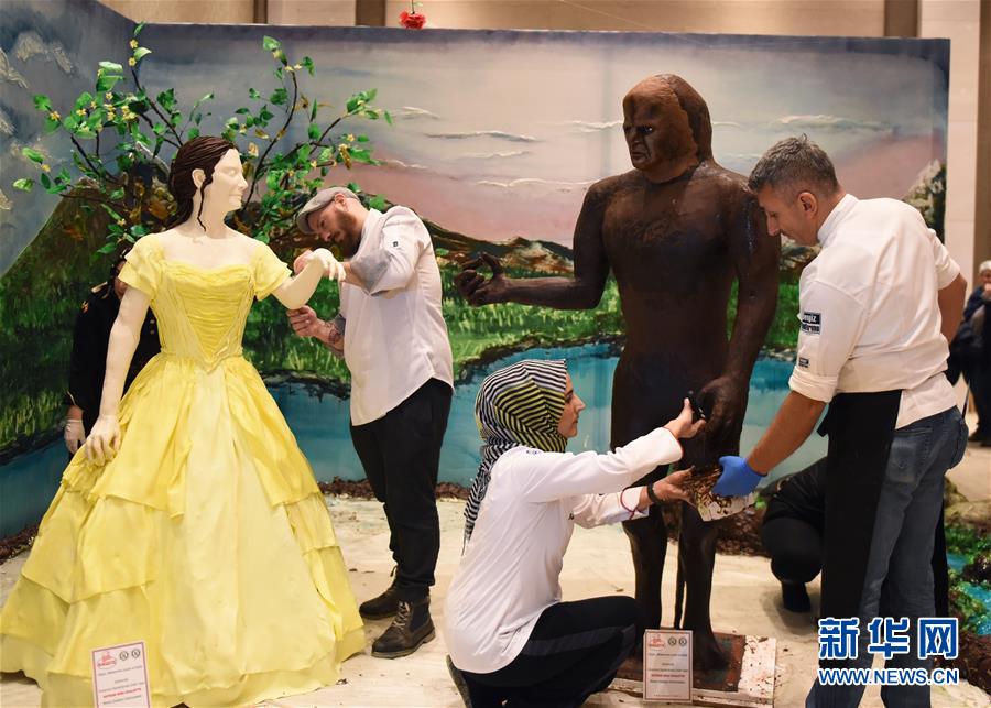 3月10日,在土耳其伊斯坦布尔,糕点师们在制作糕点作品“美女与野兽”。