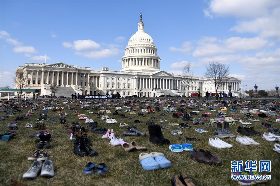 3月13日,在美国首都华盛顿,国会山前的草坪上摆放着代表枪击事件中遇难儿童的鞋子。新华社记者杨承霖摄