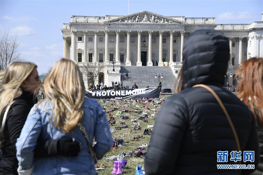 3月13日,在美国首都华盛顿的国会山前,人们在代表枪击事件中遇难儿童的鞋子前驻足。新华社记者杨承霖摄