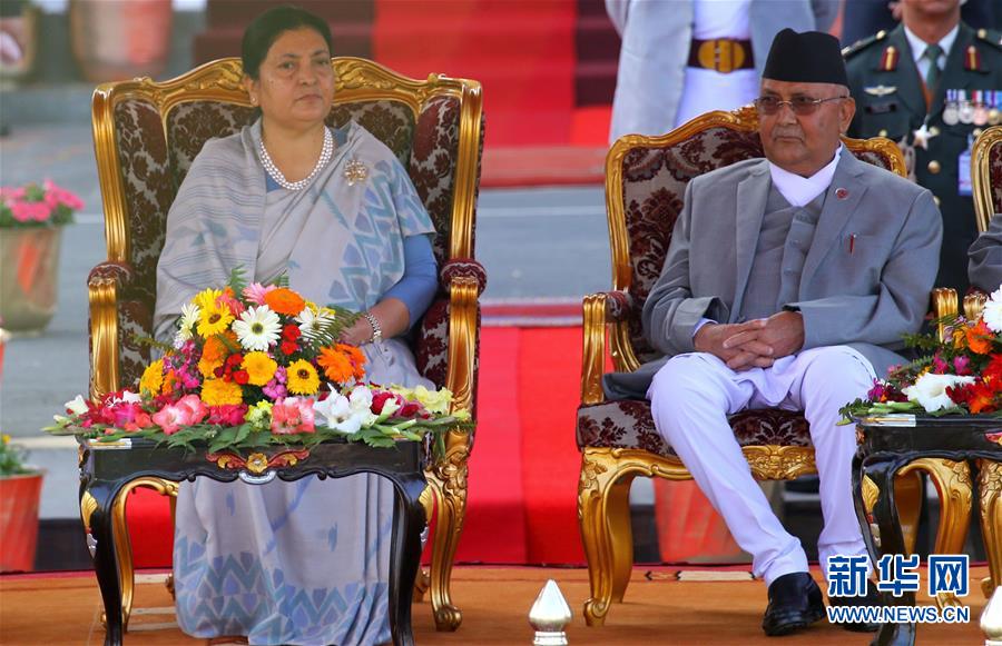 3月14日,在尼泊尔首都加德满都,尼泊尔总统比迪亚·德维·班达里(左)和总理奥利出席总统宣誓就职仪式。在尼泊尔首都加德满都13日举行的议会投票中,尼泊尔现任总统比迪亚·德维·班达里再次当选为总统。 新华社发(苏尼尔·夏尔马摄)