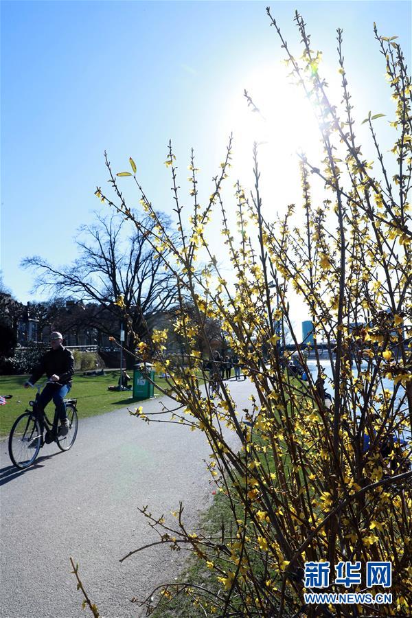 4月6日,在德国法兰克福,一名男子在鲜花盛开的美茵河岸骑行。随着天气转暖,法兰克福当地居民纷纷来到户外,享受百花盛开的春日时光。 新华社记者罗欢欢摄