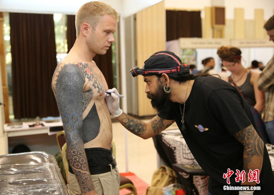 4月6日,第8届尼泊尔国际纹身大会在帕坦举行。来自尼泊尔、巴西、德国、尼泊尔、美国、泰国等国家的纹身艺术家们在大会上各施才艺。图为一名男子正在接受纹身。 中新社记者 张晨翼 摄