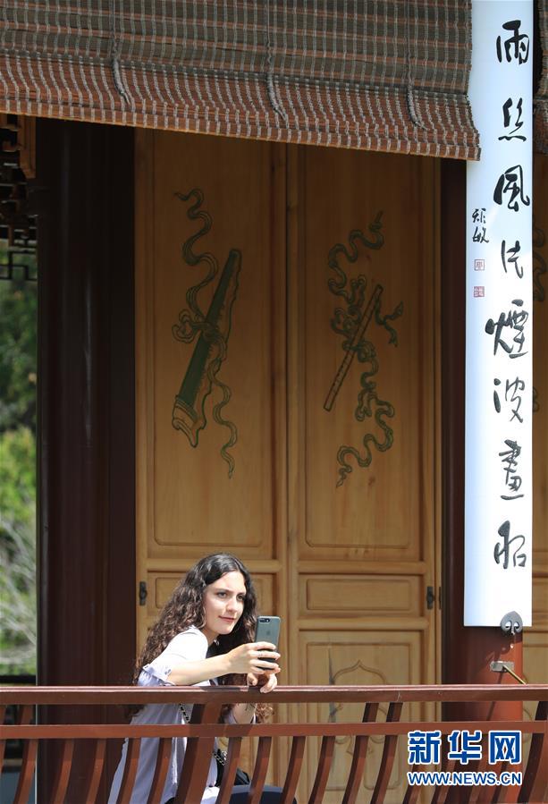 4月6日,在美国洛杉矶亨廷顿图书馆内的中国园,一位游客用手机拍照。春暖花开时节,人们纷纷来到户外,享受春意盎然的时光。 新华社记者李颖摄
