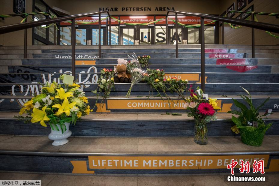 民众在“洪堡特野马”队的球场外送上鲜花,悼念遇难者。