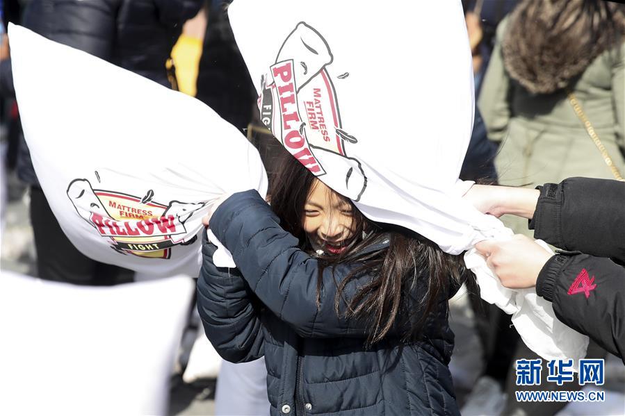 4月7日,在美国纽约,人们参加“枕头大战”。当日,美国多地举行“枕头大战”,人们在活动中释放压力,愉悦身心。 新华社记者 王迎 摄