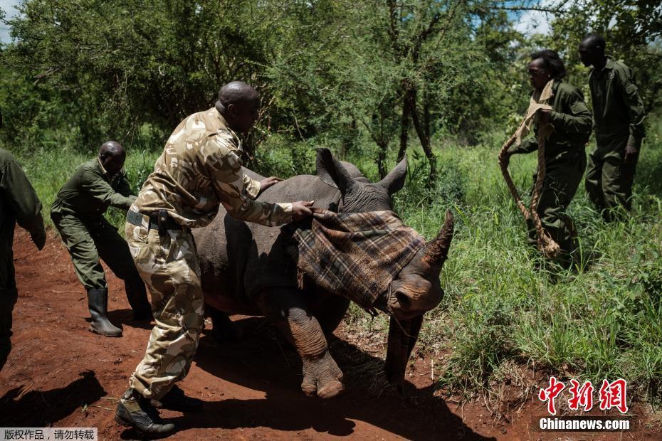 用毛毯遮挡住被注射了镇静剂的白犀牛视线,使其安静下来。