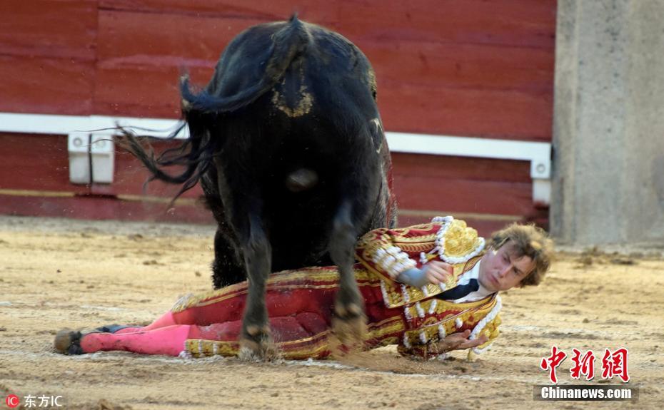当地时间2018年4月7日,西班牙托莱多,当地举行公益斗牛赛,斗牛士Roman遭公牛袭击。图片来源:东方IC 版权作品 请勿转载