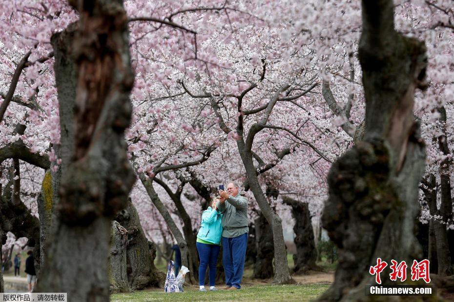 当地时间4月6日,美国华盛顿潮汐湖畔樱花盛放,游人驻足观赏。
