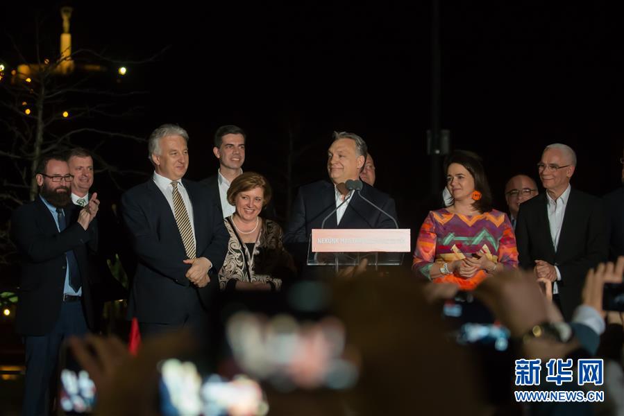 4月8日,在匈牙利首都布达佩斯,匈牙利总理欧尔班(中)在集会上对支持者发表讲话。根据匈牙利国家选举办公室8日晚公布的初步计票结果,匈牙利执政联盟(青民盟和基民党)在当天举行的国会选举中获得压倒性胜利。新华社发(弗尔季·奥蒂洛摄)