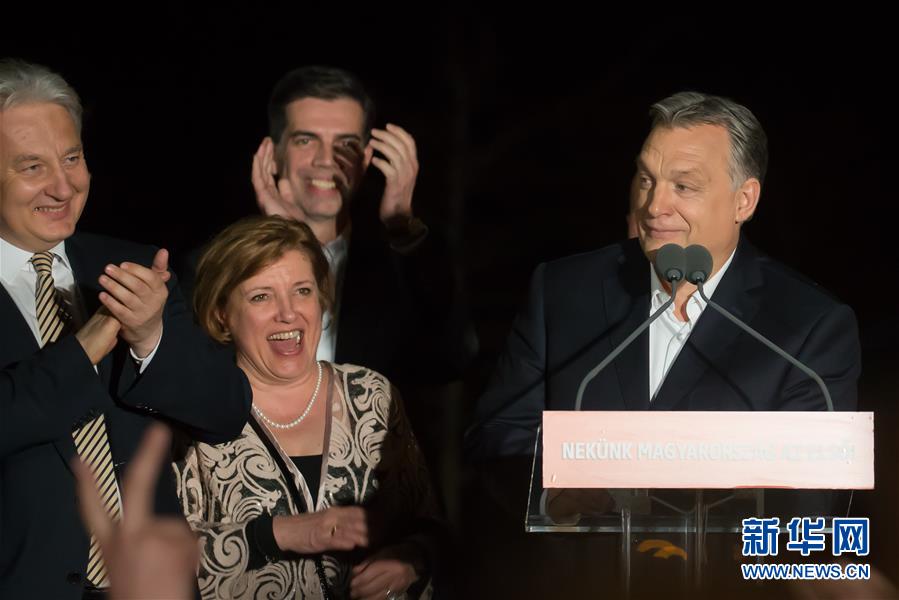 4月8日,在匈牙利首都布达佩斯,匈牙利总理欧尔班(右一)在集会上对支持者发表讲话。根据匈牙利国家选举办公室8日晚公布的初步计票结果,匈牙利执政联盟(青民盟和基民党)在当天举行的国会选举中获得压倒性胜利。新华社发(弗尔季·奥蒂洛摄)