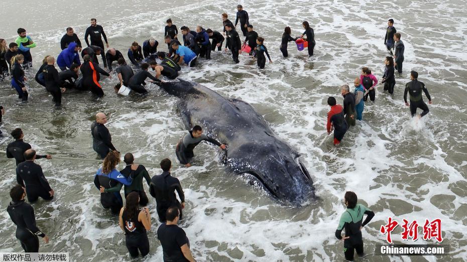 民众合力救助这条搁浅的鲸鱼。他们在沙滩上挖坑,将鲸鱼推进去,还用湿布盖住鲸鱼身体,持续泼水,保持鲸鱼体表湿润。