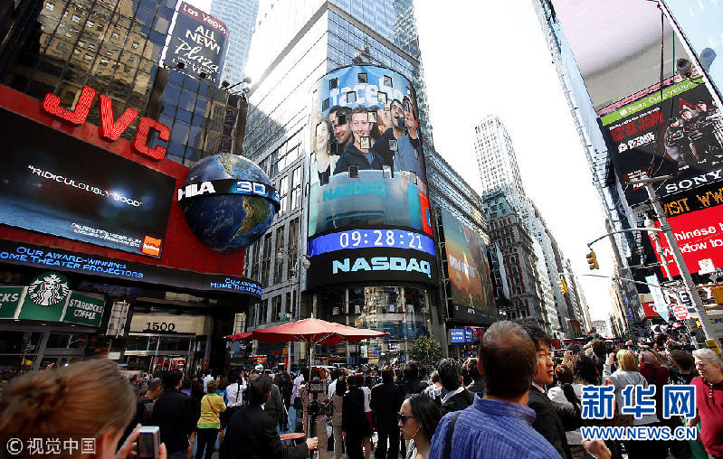 当地时间2012年5月18日,美国纽约,脸书通过首次公开募股正式在纳斯达克上市,时代广场广告牌播放上市新闻。(图片来源:视觉中国)