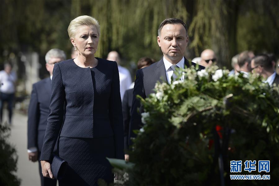 4月10日,在波兰华沙军人公墓,波兰总统杜达(前右)参加斯摩棱斯克空难遇难者悼念活动。新华社发(亚普·阿林 摄)