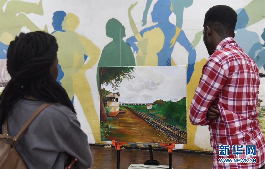 4月9日,在肯尼亚首都内罗毕,参观者欣赏中国艺术家的绘画作品。