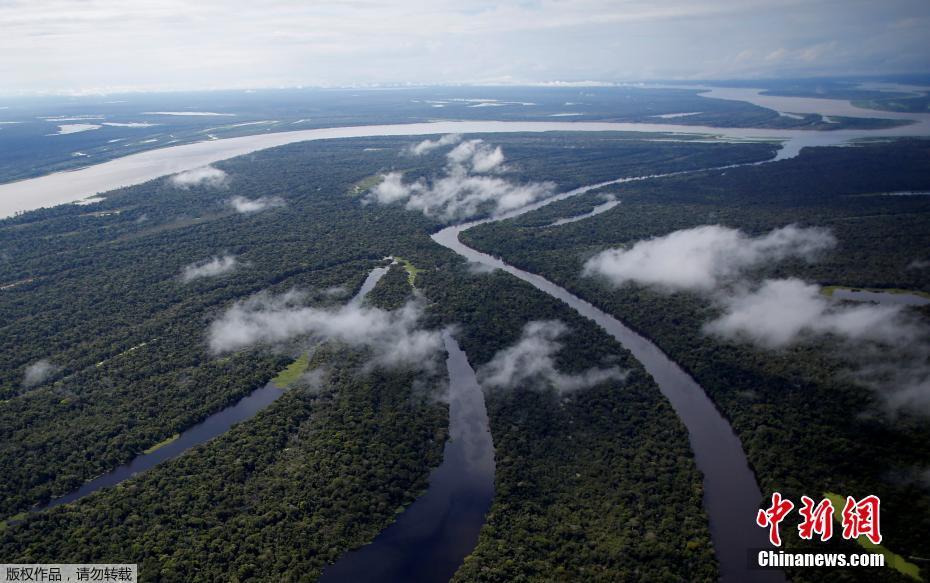 由于地跨赤道多雨地区,亚马逊水量终年充沛,亚马逊河口年平均流量为每秒22万立方米,年降水量多在1500毫米以上,并有安第斯山冰雪融水补给,水源供应充足。主流洪水期大致始于10至11月,次年3至6月进入最高洪水期,6月以后逐渐减退,至9月最低。图为俯瞰亚马逊瓦里尼地区的河道。