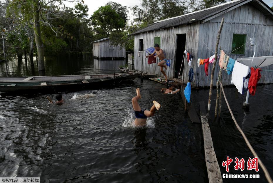 人类活动也使得美洲豹的生存空间被压缩,由于开发不当和保护不利,巴西亚马逊雨林正遭到严重破坏,热带雨林面积以惊人的速度减少,森林覆盖率已从原来的80%减少到58%,雨林中动植物的领地正在被吞噬。图为孩子们在雨林河道的水屋边玩耍。