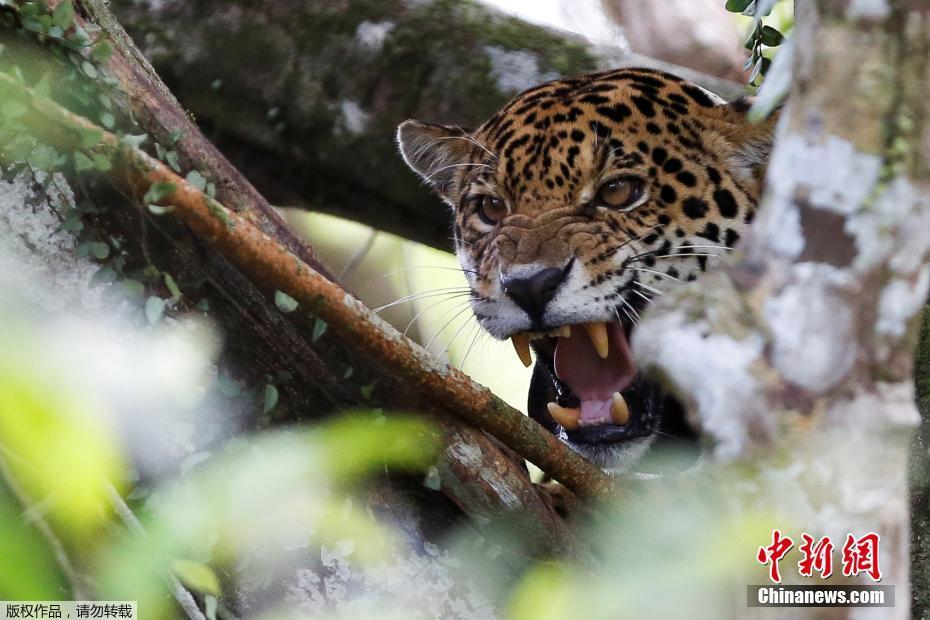 美洲虎作为美洲顶级大猫,处于食物链顶端。成年的美洲虎没有天敌,造成其死亡的原因多是由于人类及极少数同类所为(因领地争斗)。图为一只一只雌性成年美洲虎在保护区内的一棵树上咆哮。