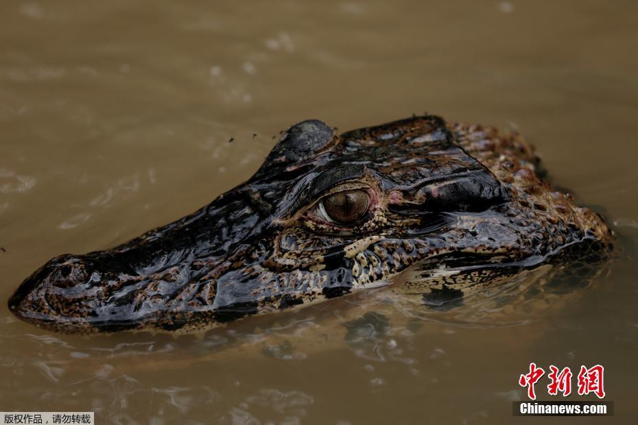 美洲虎的猎杀技能了得,在季节性泛滥沼泽地区,鳄鱼和龟类都是美洲虎的盘中餐。美洲虎是游泳健将,它们能潜水数分钟来追逐鱼类。图为Mamiraua保护区内,一只鳄鱼在水中游泳,在洪水季节,它们常常是美洲虎捕食的对象。