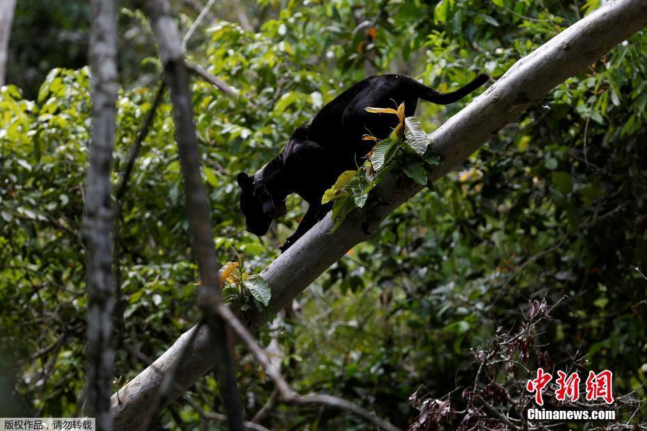 自从上世纪70年代中期,美洲虎毛皮的国际市场已被关闭,商业性的狩猎活动基本停止,但美洲虎爪子,牙齿和皮肤仍有广泛的需求。有研究人员表明,湿地生态旅游带来的实际经济价值非常大,美洲虎应该被保护起来,作为发展旅游的金字招牌。图为一只黑色雄性美洲虎在Mamiraua保护区内的树枝上穿梭。