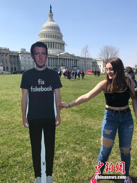 当地时间4月10日,美国社交媒体平台脸书的首席执行官马克·扎克伯格在美国国会参议院相关委员会的联合听证会上就数据滥用问题作证,一个名为“声音”的公益组织在国会前的草坪上摆放扎克伯格真人形象大小的宣传牌,要求脸书等公司“快速行动、修复漏洞”。 中新社记者 邓敏 摄