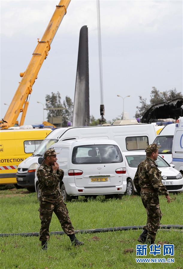 4月11日,在阿尔及利亚卜利达省,两名士兵在军机坠毁现场工作。阿尔及利亚国防部当地时间11日上午发布消息说,当天早些时候发生的军机坠毁事故造成的死亡人数已达257人。 新华社发