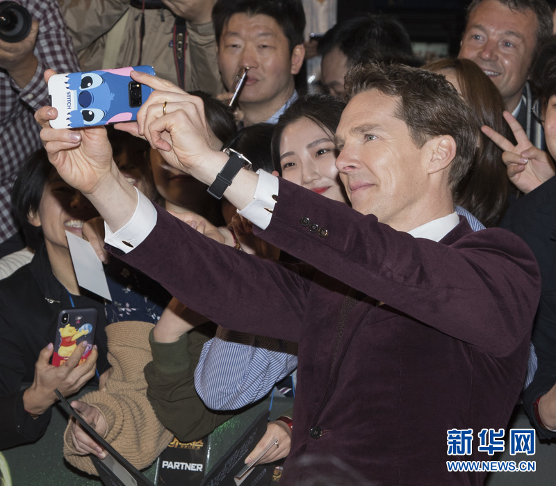 4月12日,《复仇者联盟3:无限战争》演员康伯巴奇在韩国首尔的首映礼红毯上同影迷自拍合影。新华网发 李相浩摄