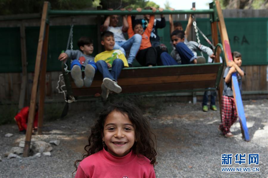 4月12日,在希腊雅典以北约86公里处的里措纳难民营,儿童在秋千上玩耍。新华社发(马里奥斯·罗洛斯摄)