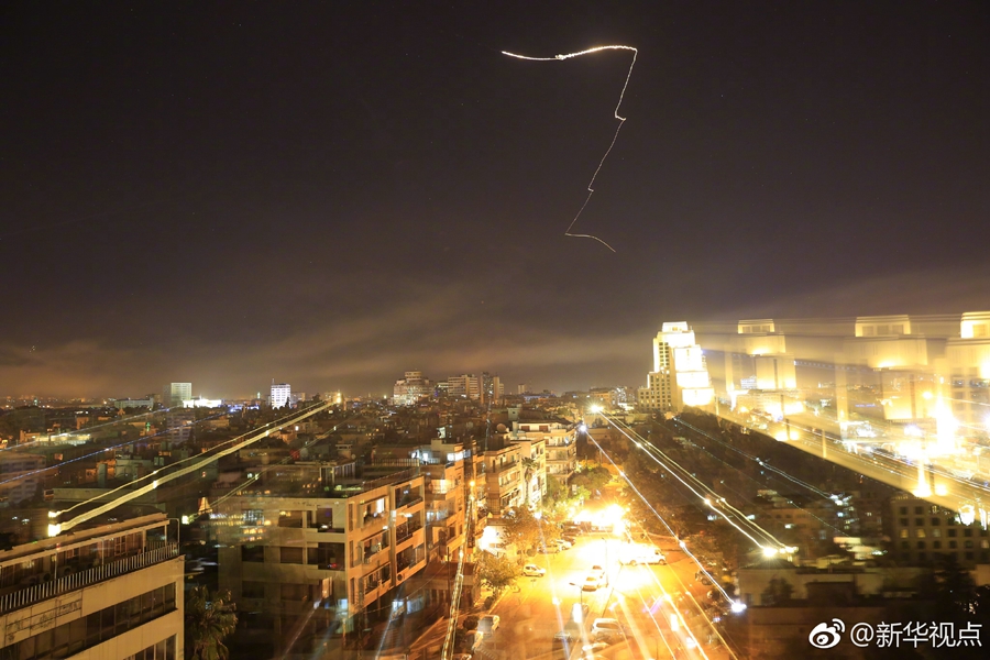 叙利亚国家电视台14日报道说,当地时间14日凌晨,美国等国对叙首都大马士革发起军事行动。(新华社/美联)