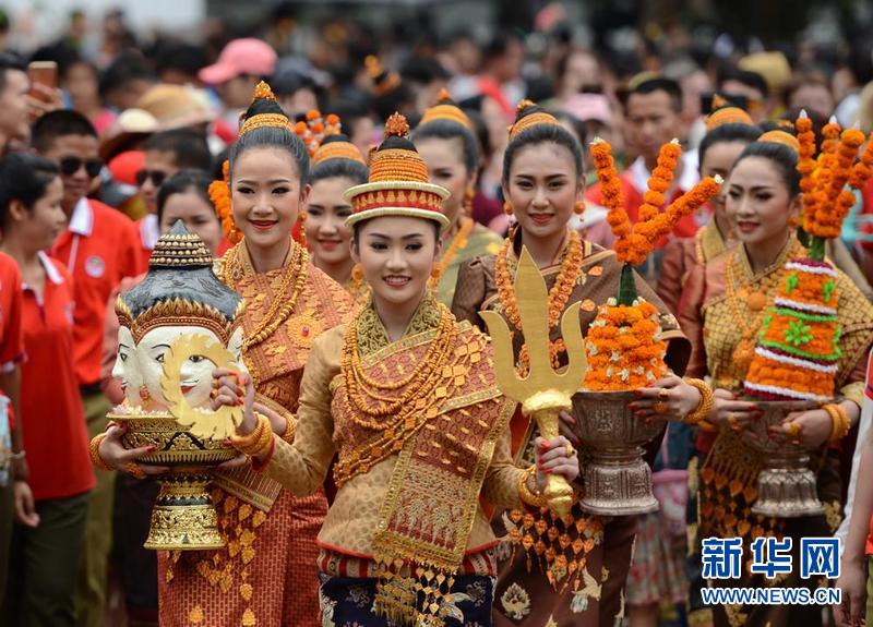 4月15日,老挝琅勃拉邦,参加泼水节庆祝活动的琅勃拉邦宋干小姐。新华网发 刘艾伦摄